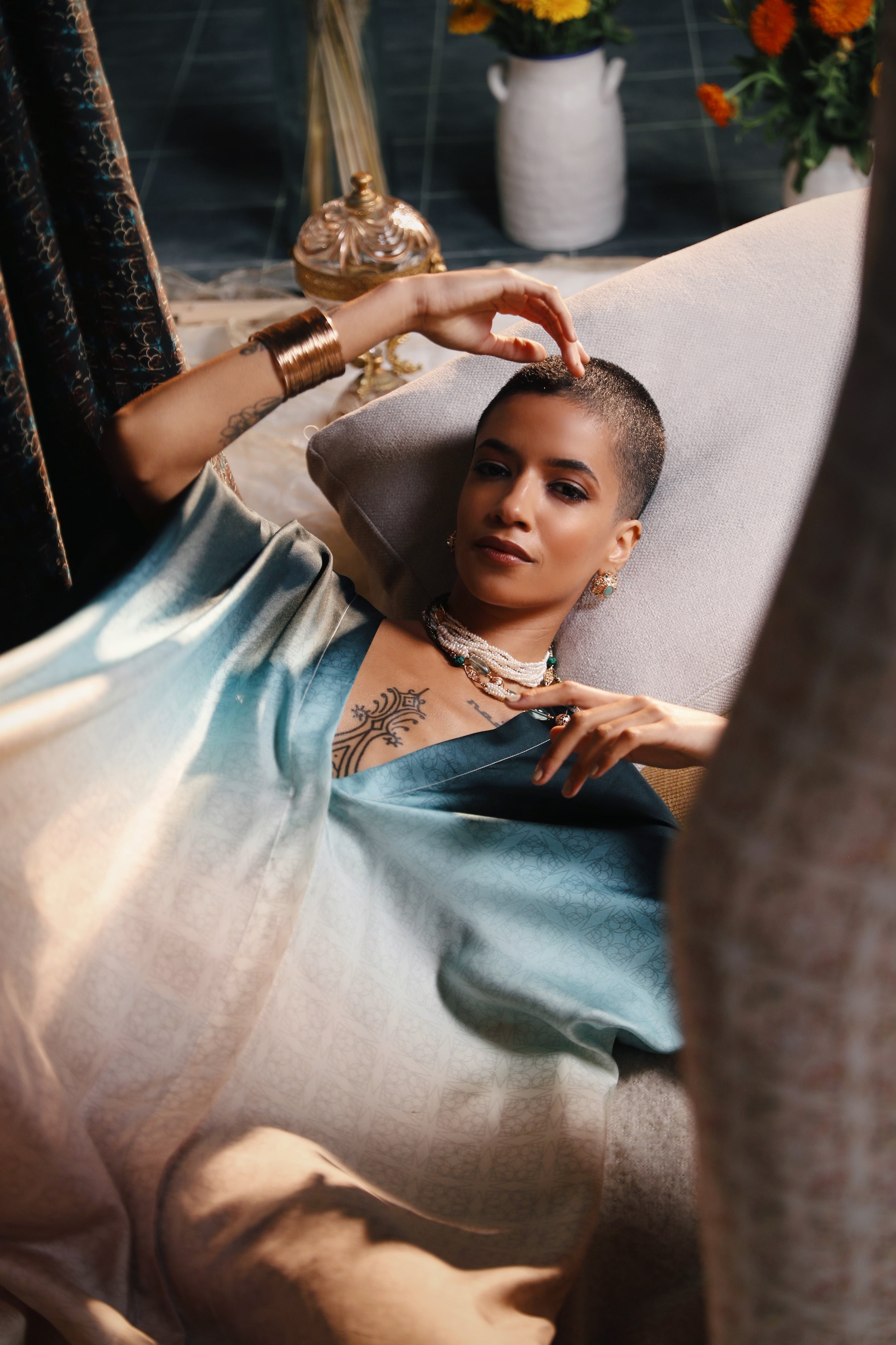 The Mirella satin blouse has subtle and elegant midnight blue undertones associated with the brand's moniker printed in a multicolor version reminding us of the colors of Lagos.